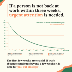 It’s a proven fact that the longer someone is off work, the harder it is to get them back. Statistics show that the likelihood of a full return to work after six weeks off work “fully unfit” is 50% and progressively declines to less than 20% at six month so the first few weeks are crucial.
